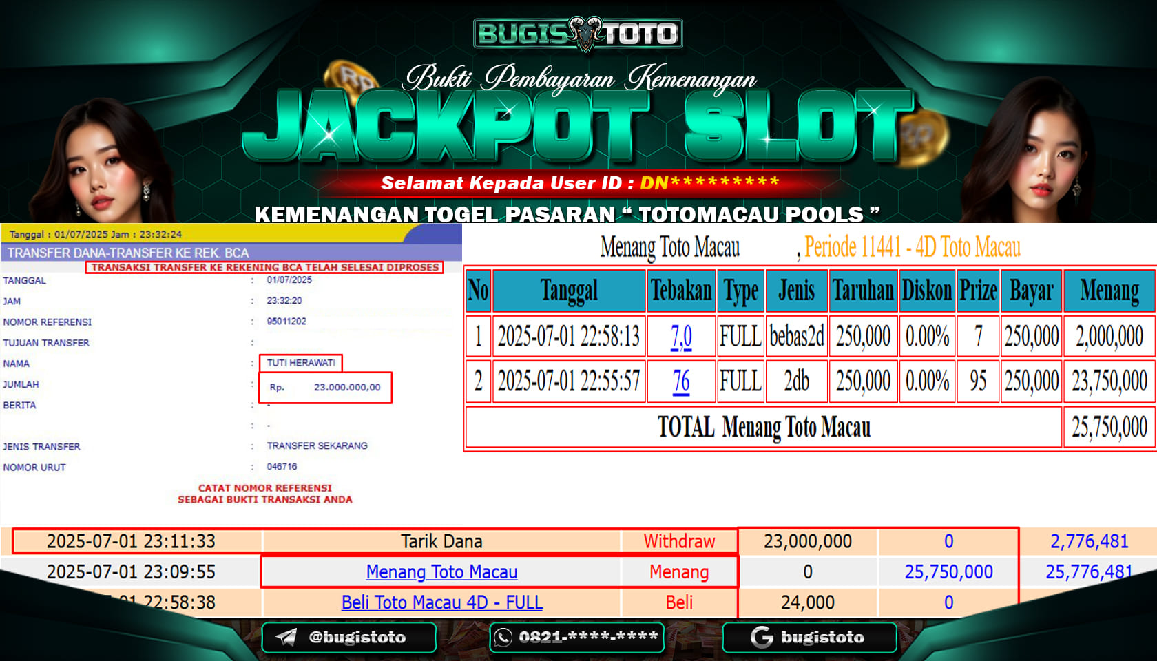 BUKTI JACKPOT BUGISTOTO MENANG SLOT RP-7.000.000, JUTA